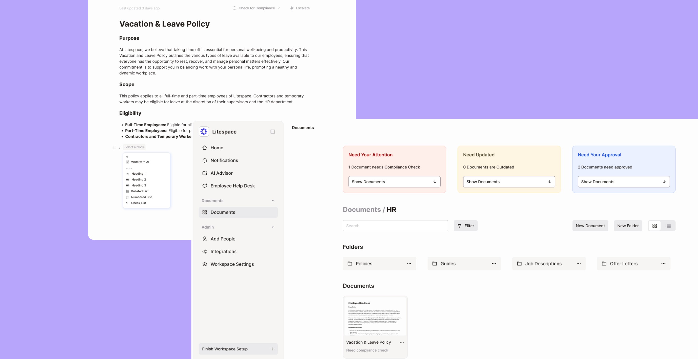Designing a 0-1 AI-powered chat assistant, enabling HRs automate workflows by receiving instant answers and organizing documents. This project focused on the pivot from all-in-one solutions to an intelligent chat experience.