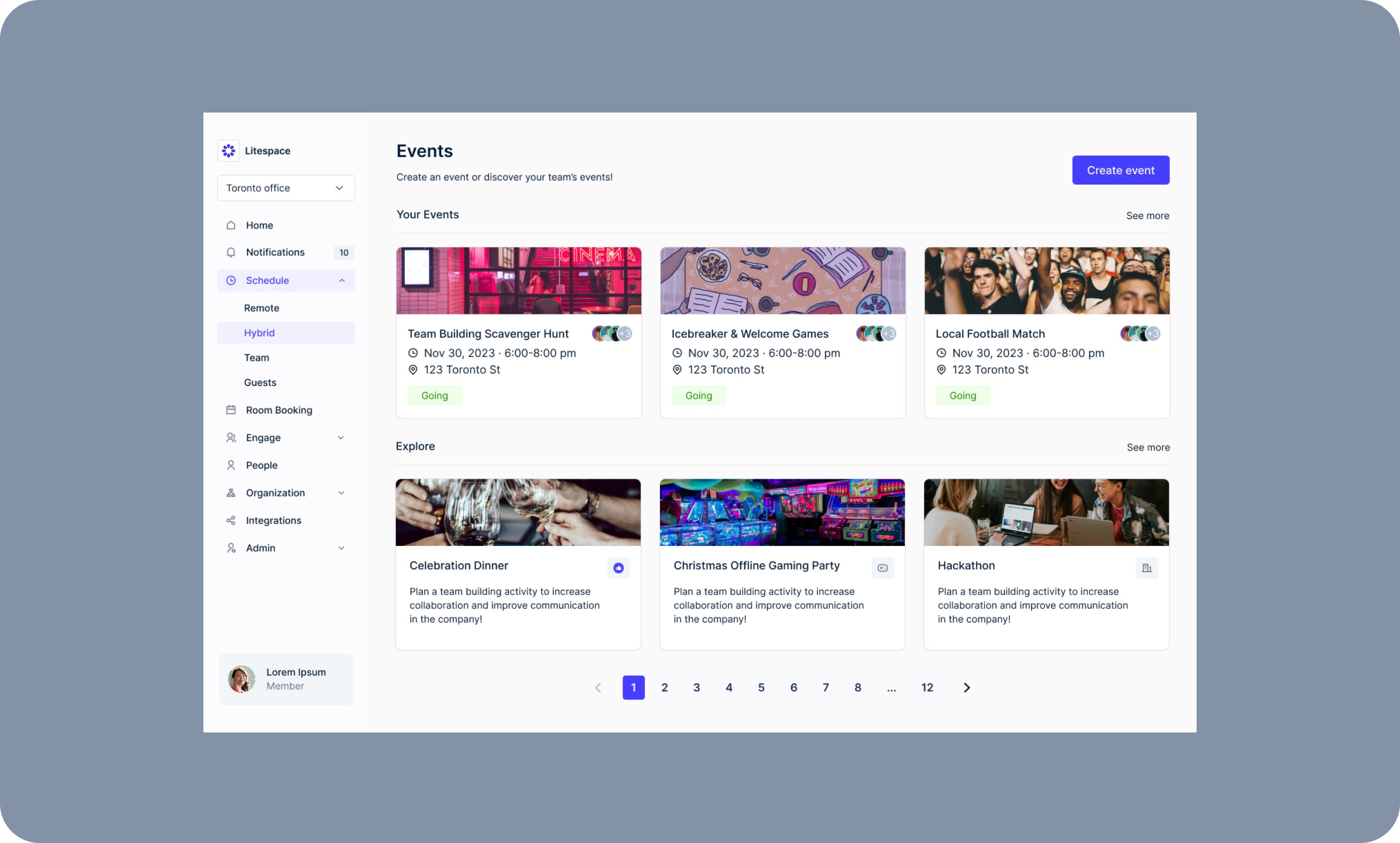 Optimizing event discovery and scheduling flows to foster connection in hybrid environments. Implemented a filtered-based discovery, scalable event templates, and polling to lower the friction of hosting and attending workplace events.
