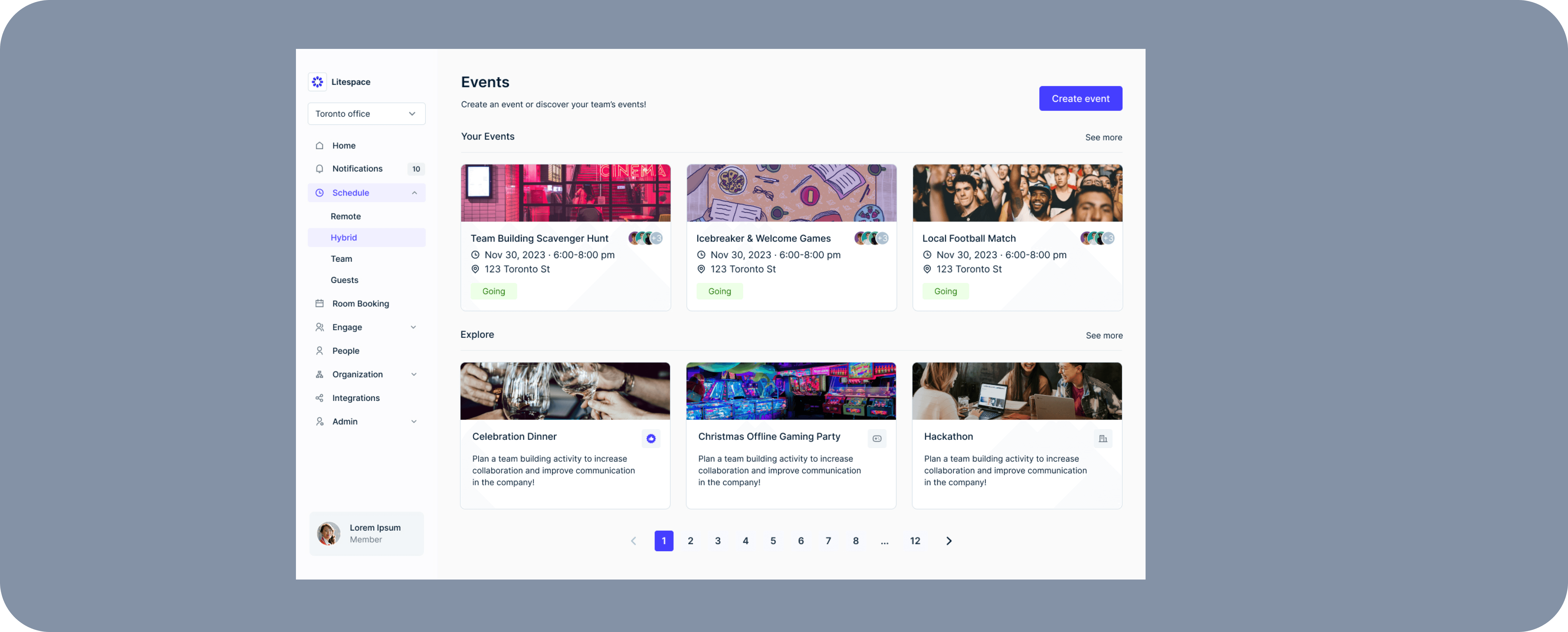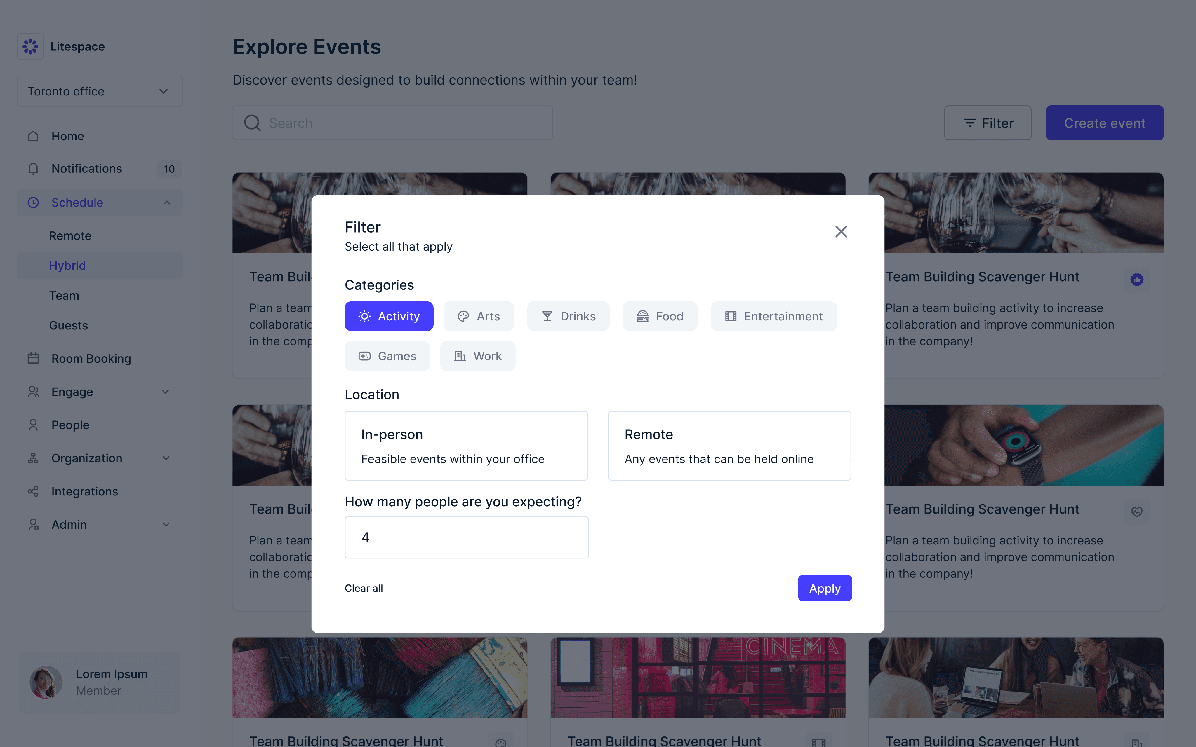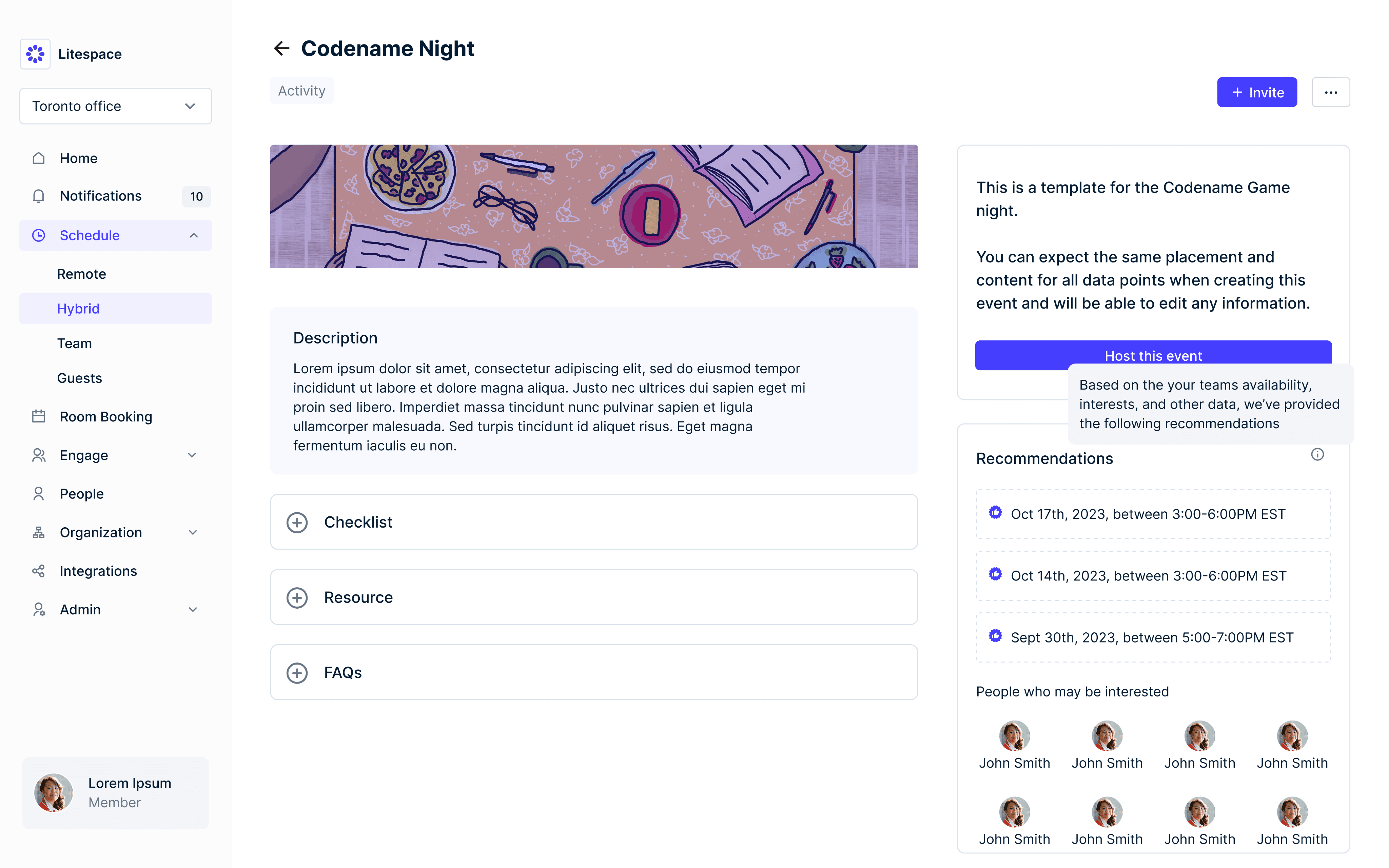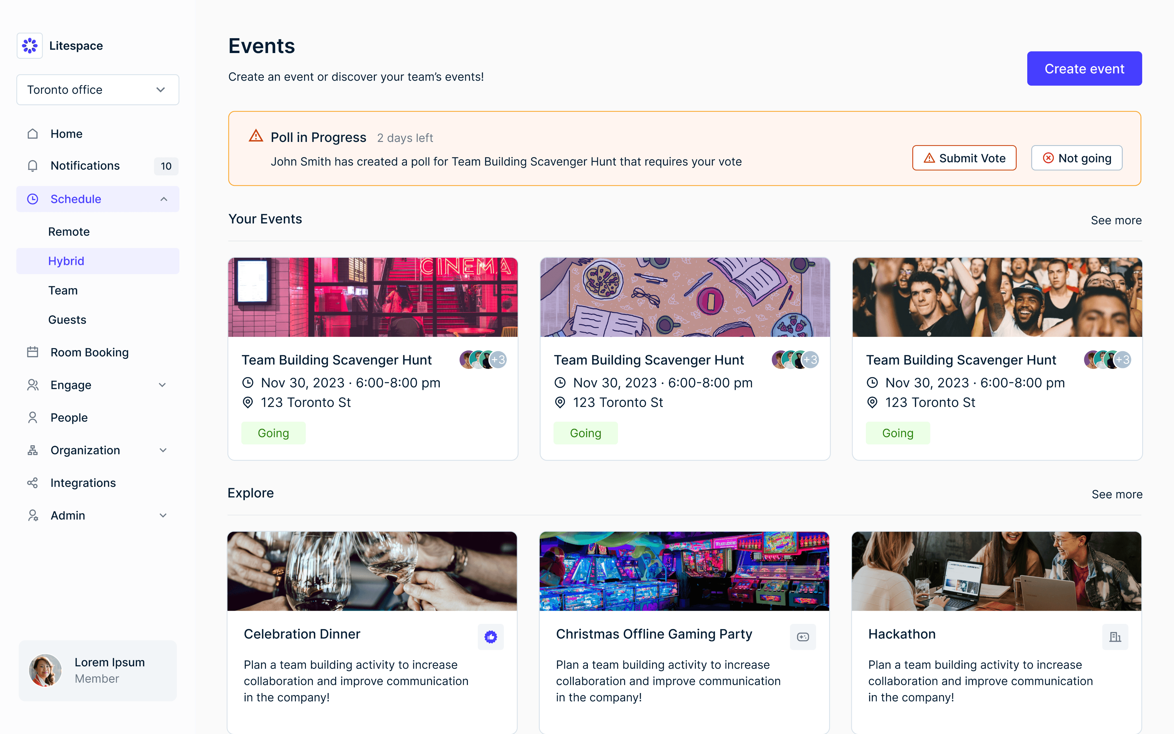 Litespace’s Event Management is a desktop-based platform that enables employees to arrange online and in-person meetups. Following the transition to hybrid work in 2024, our internal tooling encountered a critical bottleneck. With data revealing a 65% drop-off rate at the “Create Event” button. This friction stemmed from a high-effort administrative burden, as organizers have to manually input titles, descriptions, venue sourcing, and checking teammate availabilities. Our clients expressed a desire to lead events but often faced "blank page paralysis," unsure of what to organize, where to host it, or whether their colleagues would actually attend.